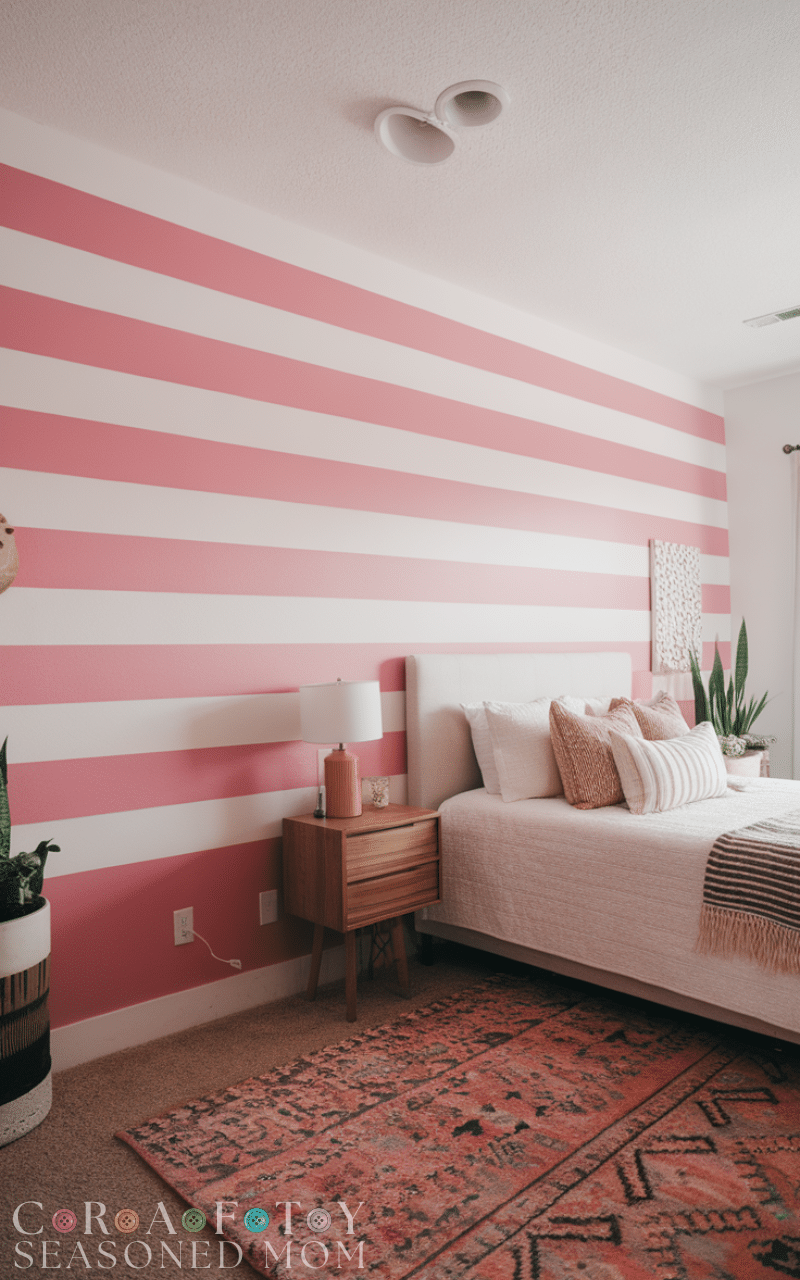 Adding white stripes to a pink wall creates a lively and dynamic look. Vertical stripes can make the room appear taller, while horizontal stripes make it feel wider.