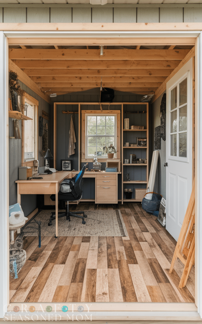 Vinyl flooring is a stylish and low-maintenance shed flooring idea. It resists moisture, stains, and wear, making it suitable for sheds converted into offices or craft rooms. Vinyl sheets or planks are easy to install and clean. These shed flooring ideas combine comfort and durability while offering a finished look that elevates the overall shed interior.