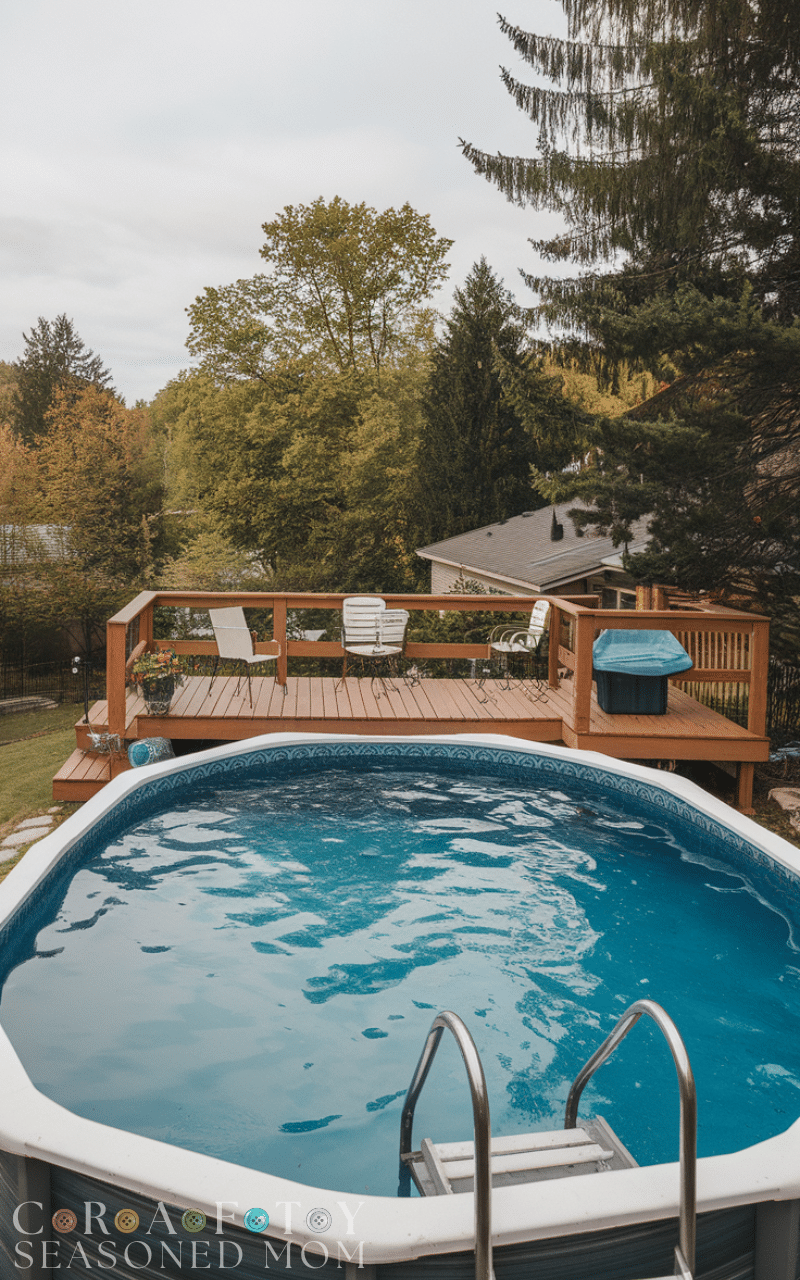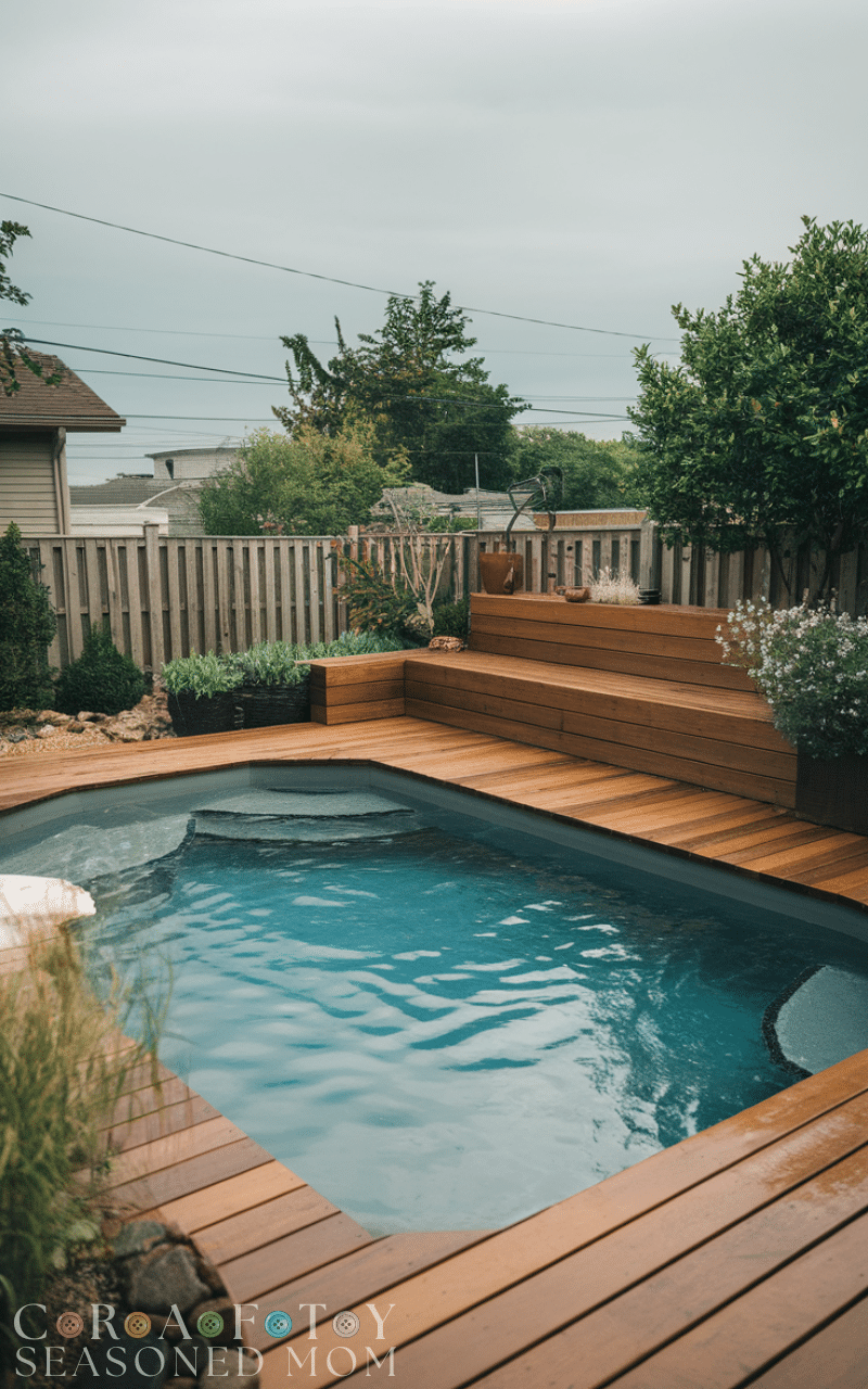 Even a small, inexpensive pool can feel luxurious with minimal decking. This small backyard pool idea uses affordable wood, composite, or concrete to create a clean, functional area that frames the pool beautifully and safely.