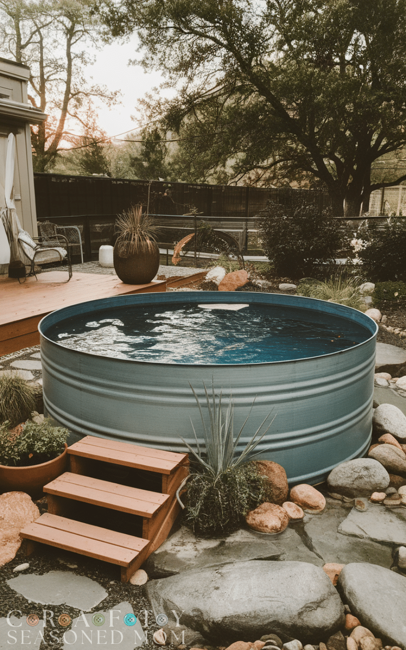 Using a stock tank as a mini pool is a creative, inexpensive option. This small backyard pool idea works especially well for cooling off in hot weather and can be dressed up with decking, plants, or seating for a chic, casual vibe.