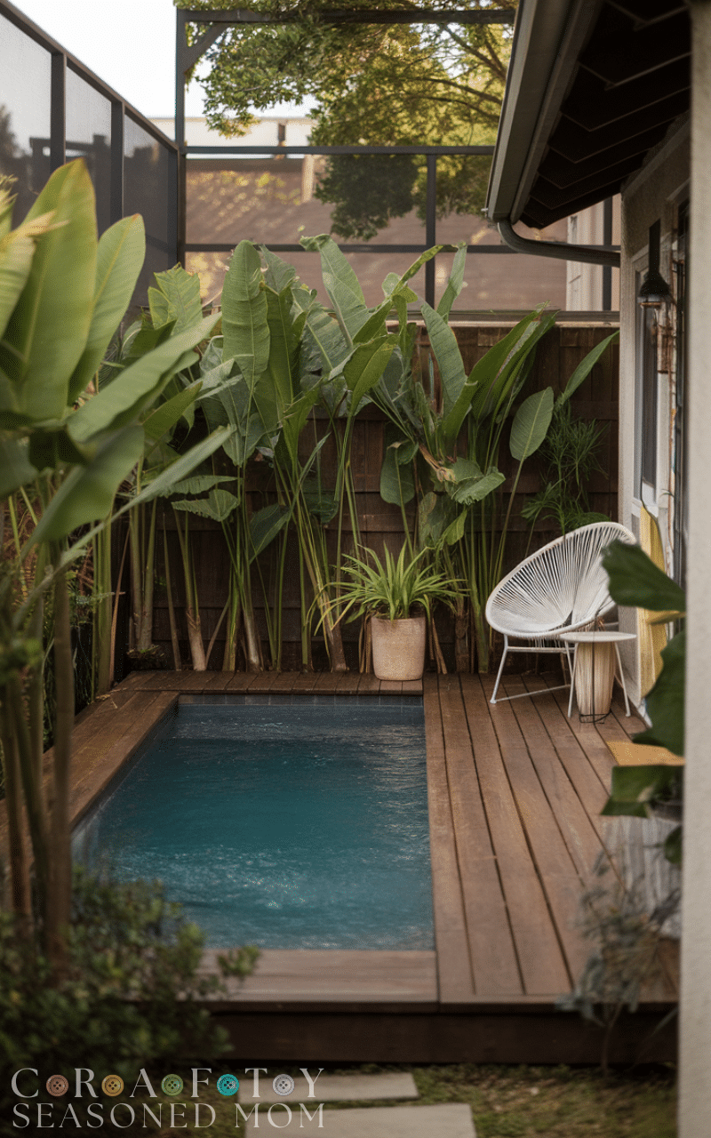 Floating loungers, pool lights, or plants enhance your small pool area affordably. This small backyard pool idea on a budget adds style and comfort without costly renovations or expansions.