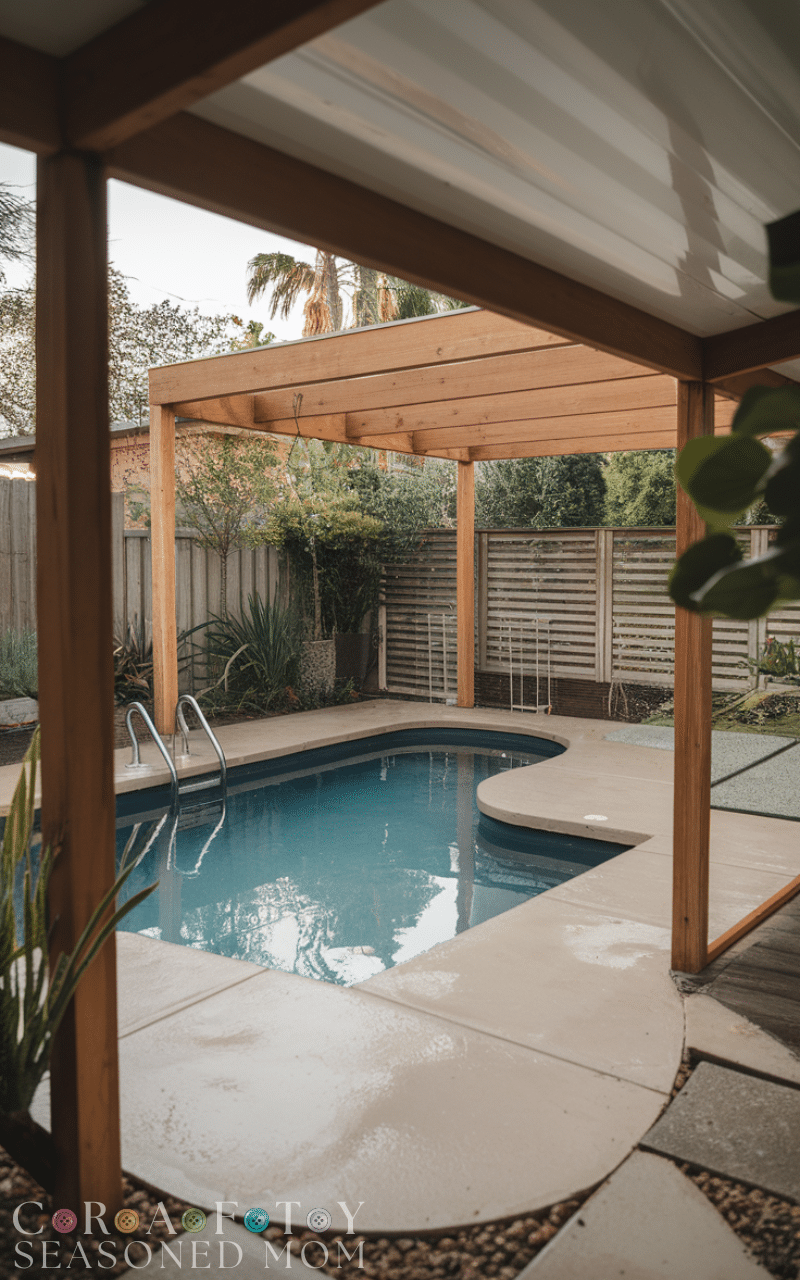 Adding screens, fencing, or tall plants improves aesthetics and privacy. This small backyard pool idea on a budget creates a cozy, secluded atmosphere while defining the pool area without major construction.