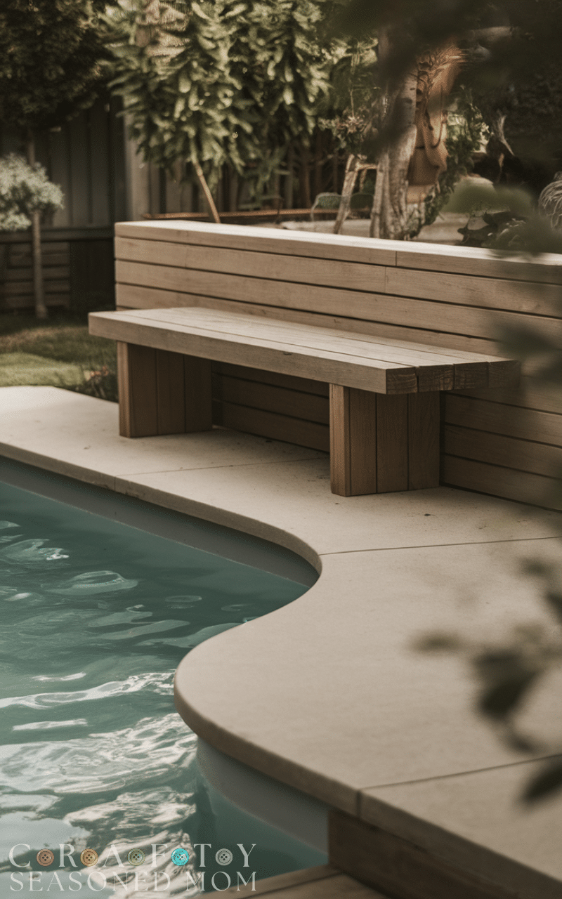 Adding a bench or ledge around a small pool maximizes usability. This small backyard pool idea ensures space is functional for lounging, placing drinks, or socializing without increasing pool size or cost.
