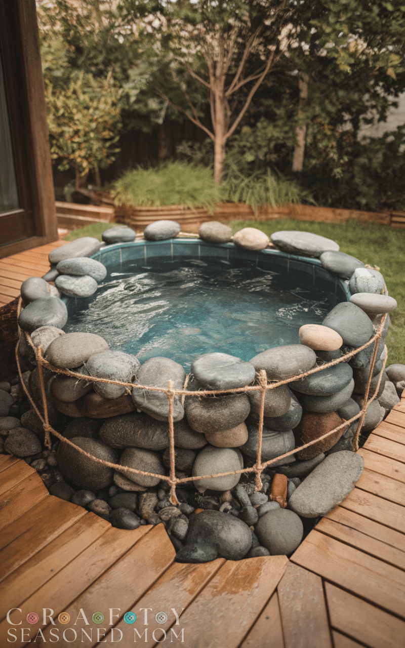 Create a mini plunge pool with stones or natural materials. This small backyard pool idea on a budget doubles as a decorative element while providing a refreshing spot to cool down. It works well in modern or rustic backyard designs.