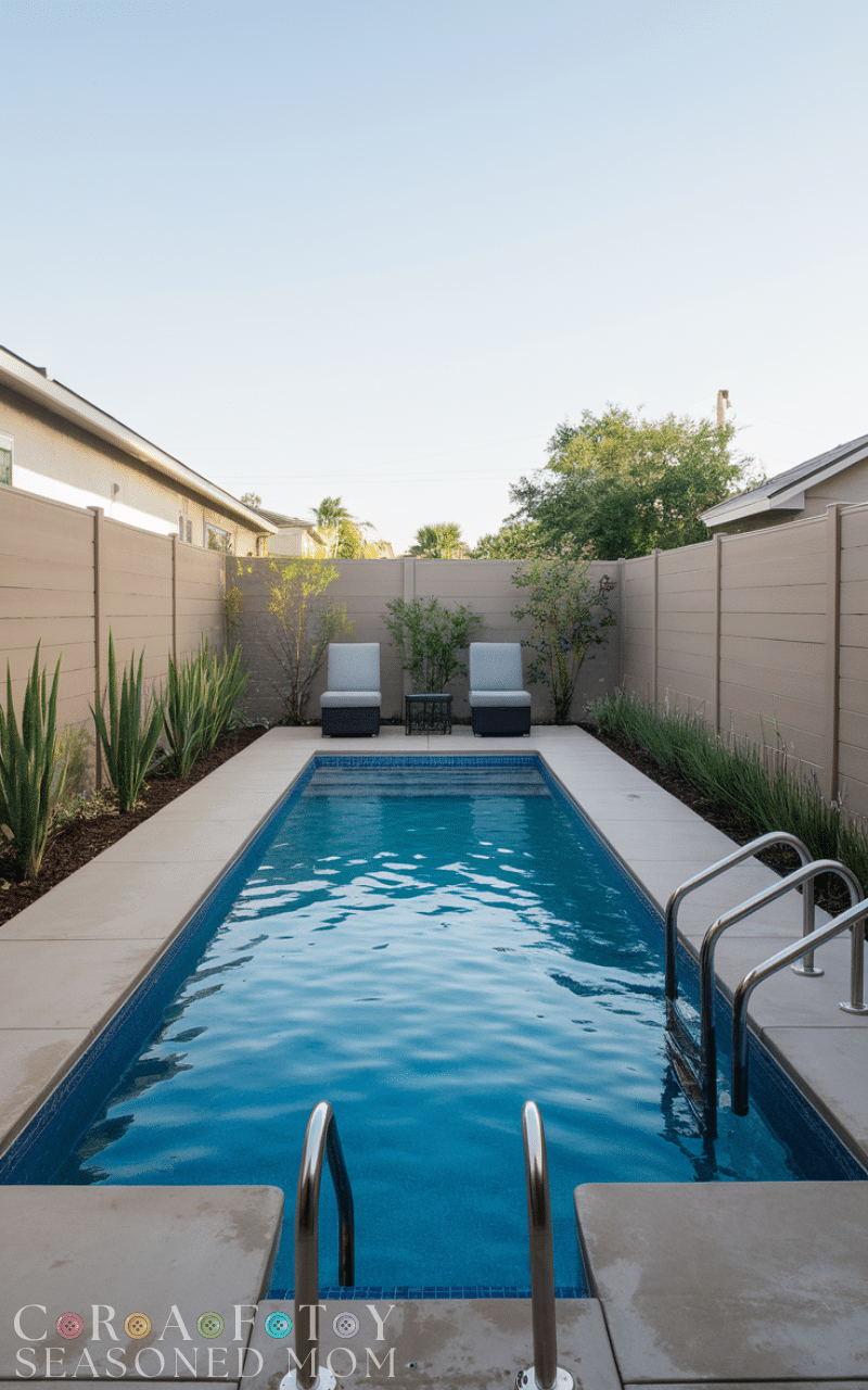 If your backyard is narrow, consider a small lap pool. This small backyard pool idea combines exercise and relaxation while saving space and money, offering functionality without needing a large area.