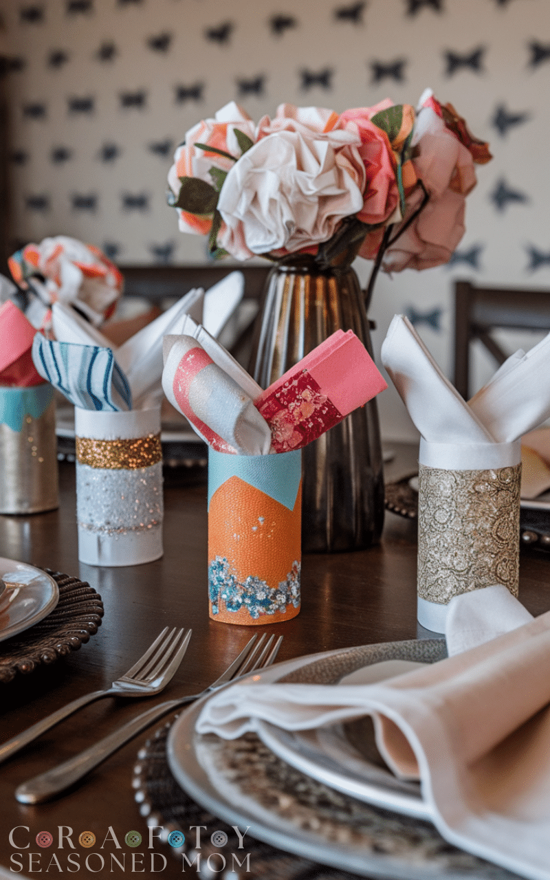 Cut toilet paper rolls into smaller rings and decorate them with paint, glitter, or fabric to make stylish napkin holders. These easy toilet paper roll crafts add a personal touch to your dining table and are a great way to reuse materials.