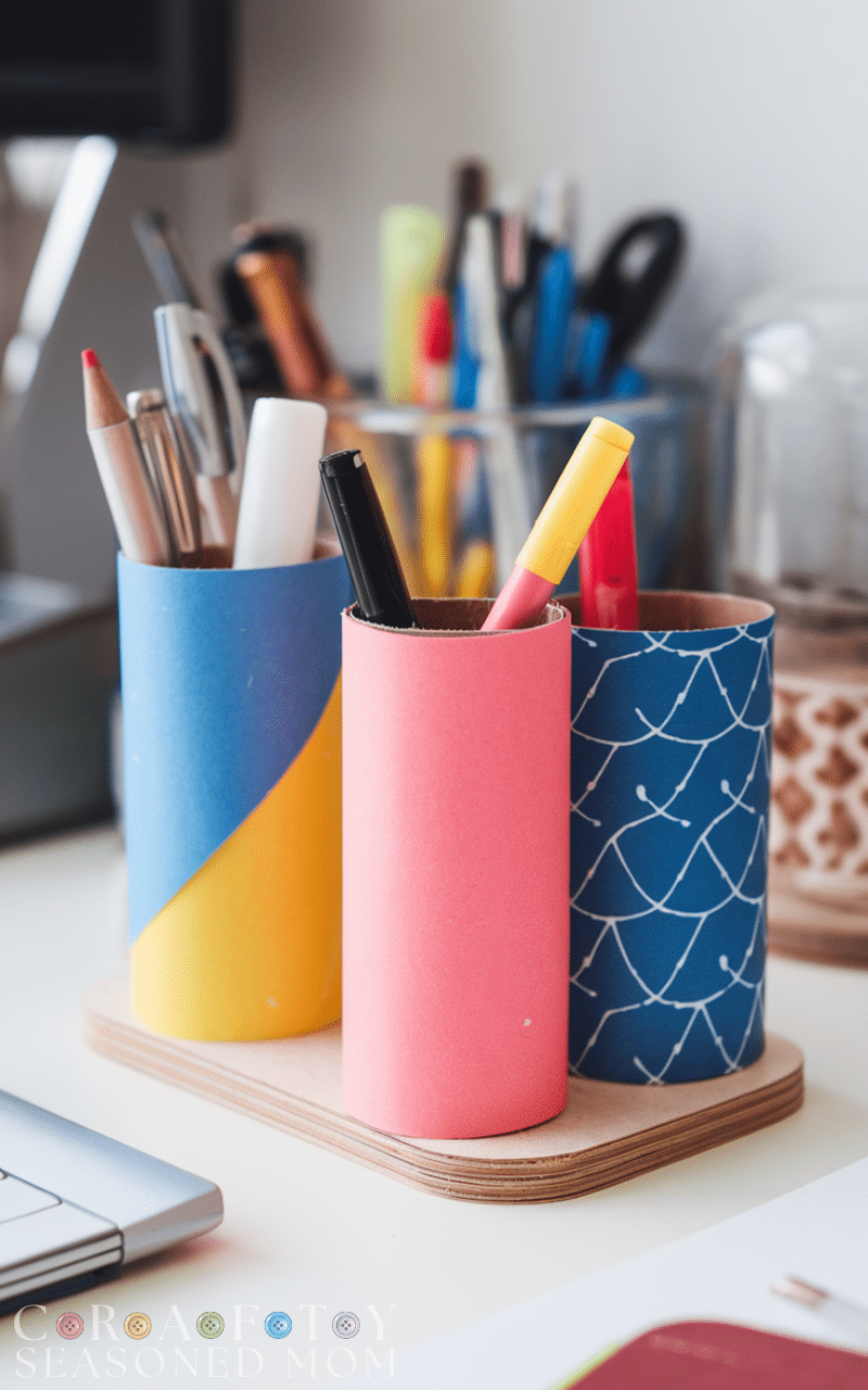 Transform empty toilet paper rolls into mini desk organizers. Cover the rolls with colorful paper or fabric, glue them onto a base, and use them to store pens, pencils, or small office supplies. This simple toilet paper roll craft helps keep your desk tidy while adding a cute, handmade touch.