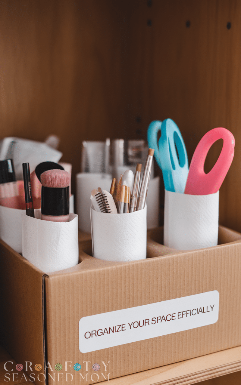 Place several toilet paper rolls upright in a box or drawer to separate small items like makeup, office supplies, or craft tools. This toilet paper roll craft is practical, budget-friendly, and helps organize your space efficiently.