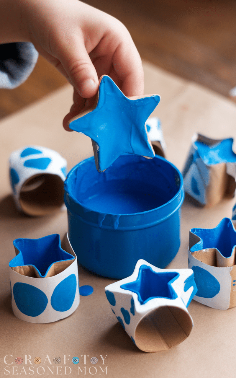 Cut shapes (like stars or hearts) into the ends of toilet paper rolls and dip them in paint. Stamp onto paper or fabric for a fun pattern. This simple toilet paper roll craft encourages creativity and is a hit with kids’ art projects.