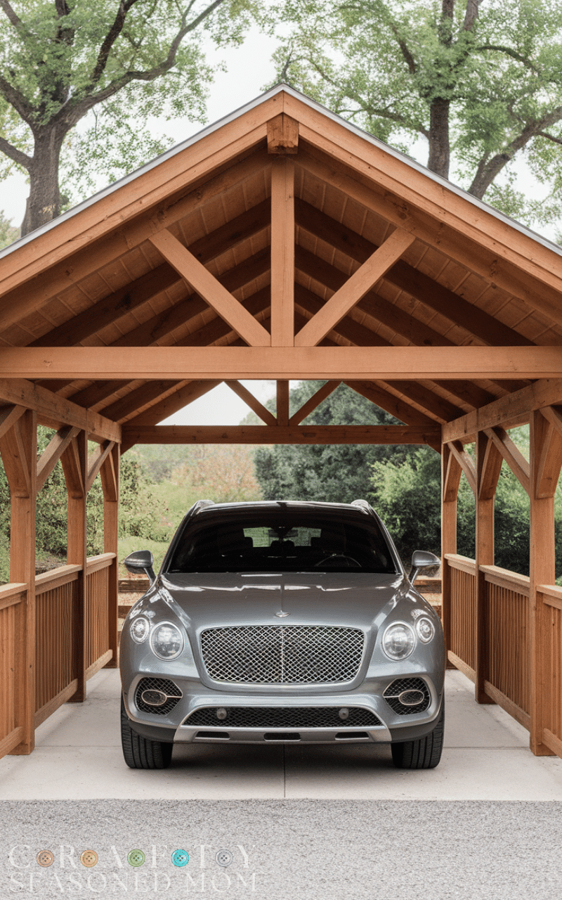 I like how this type of carport feels simple but stylish at the same time. You can easily add hanging plants, lanterns, or fairy lights to make the space more inviting. Among many Wooden Carport Ideas, this rustic option stands out because it feels timeless and cozy while still doing its main job—protecting your vehicle from sun and rain.