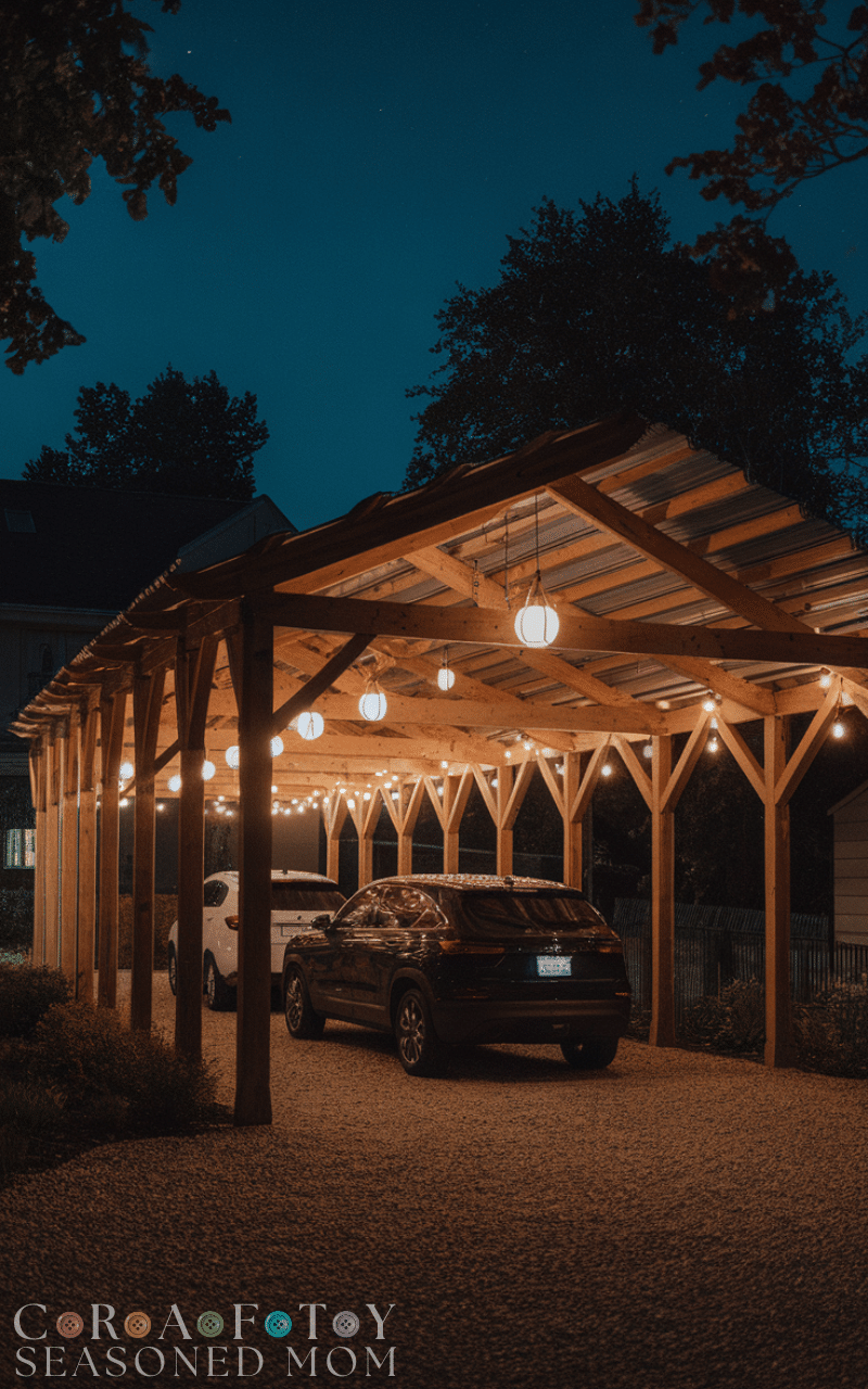 2. Wooden Carport with Outdoor Lighting