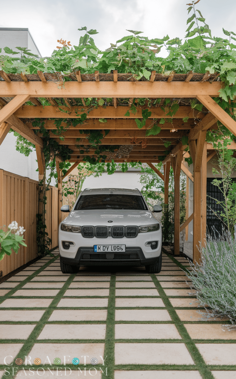 A covered wooden carport with vine roof provides shade and greenery above your vehicle and the vines grow naturally and create a beautiful canopy and you can plant flowering vines for color and fragrance and the wooden frame supports the plants safely and this wooden carport idea makes your parking area blend with your garden and adds a fresh and relaxing look and it is perfect for nature lovers and adds personality to your outdoor space.