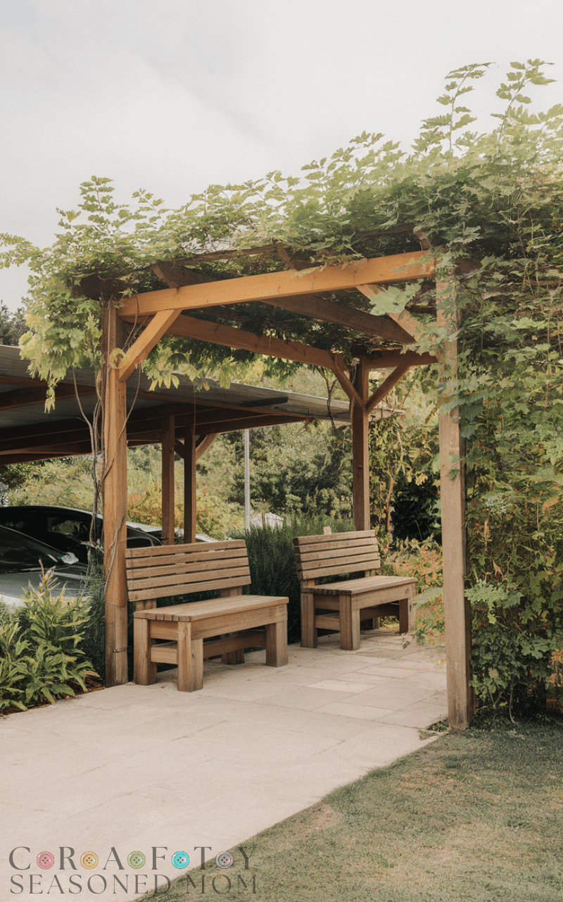 7. Carport with Wooden Pergola and Benches