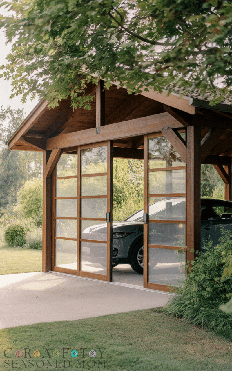 A wooden carport with sliding doors offers protection and privacy and keeps your car safe from rain and wind and the sliding doors are easy to operate and add a modern twist to the classic wooden carport design and you can stain the wood to match your house and this wooden carport idea is perfect for homeowners who want security and style together and it also makes the space multifunctional when needed.