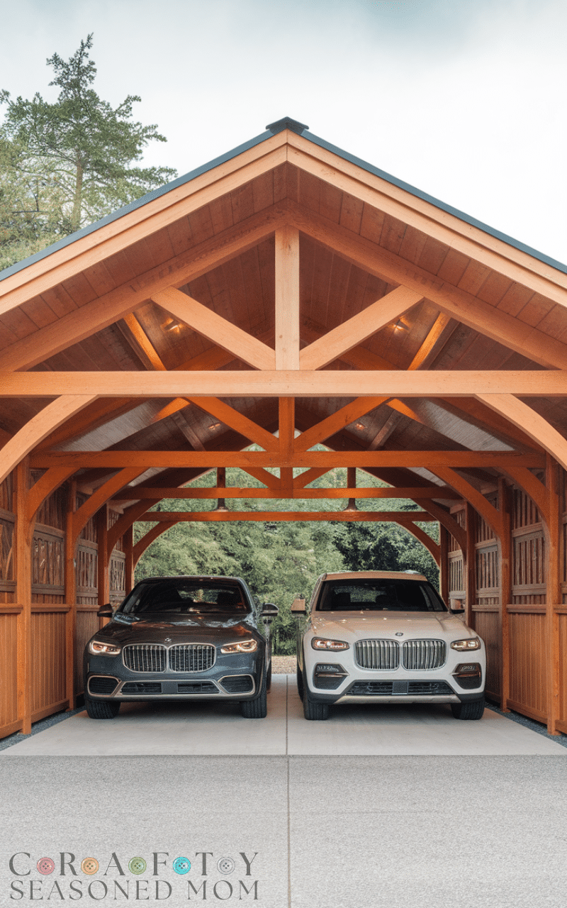 A double wooden carport gives space for two vehicles and keeps both cars safe and protected and the wooden structure can be customized with decorative beams and side panels and it looks stylish and organized and this wooden carport idea is ideal for families with multiple cars and it adds a strong and natural appeal to your home and you can also add LED lighting to improve safety and enhance the aesthetic at night.