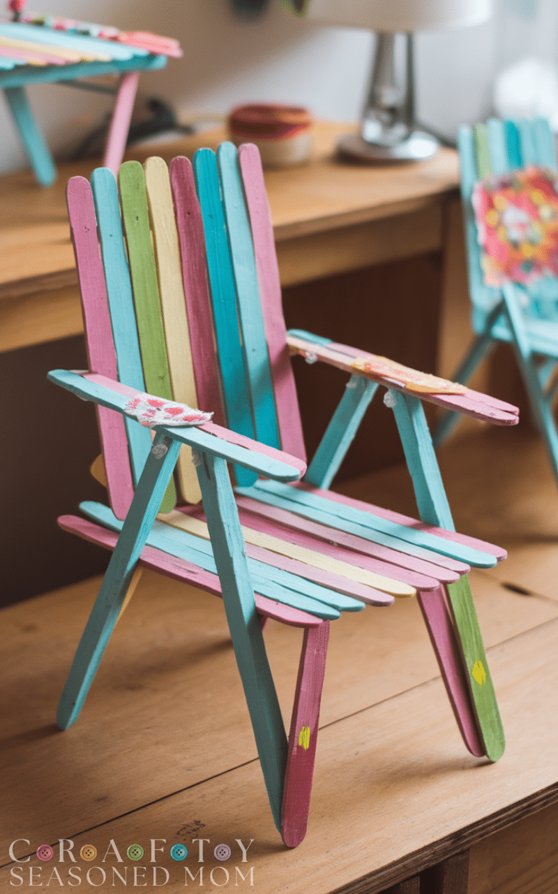 Mini chairs made from popsicle sticks are adorable décor pieces or doll furniture. Glue sticks together to form the seat, back, and legs, then decorate with paint or fabric. Popsicle stick crafts like mini chairs let you practice precision while creating something cute and functional for display or play. It’s a fun project for kids and adults alike, combining creativity with problem-solving and hands-on crafting fun.