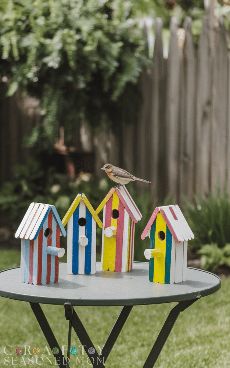 Build small birdhouses using popsicle sticks for a fun outdoor project. Glue sticks together to create walls, roof, and base, then paint or decorate. Popsicle stick crafts like birdhouses are practical, giving birds a safe spot while letting you enjoy crafting. Kids especially love assembling and painting them, making it a perfect family-friendly project. It’s an affordable, creative way to combine nature and DIY fun, while giving your backyard a charming handmade touch.