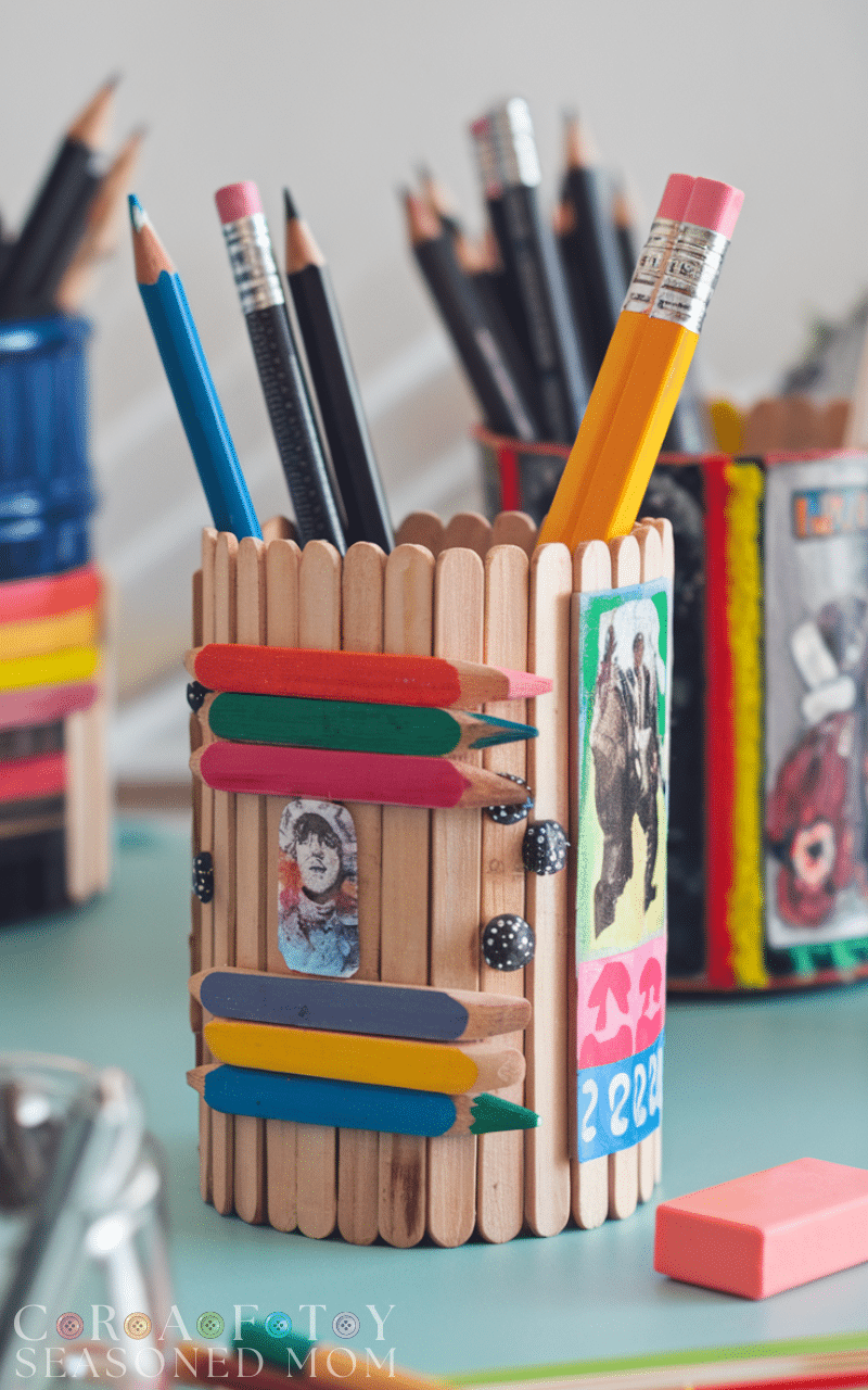 Build a pencil holder by stacking and gluing sticks around a small jar or cardboard cylinder. Popsicle stick crafts like this are functional, keeping desks organized while showcasing creativity. Paint or decorate the holder to match your style. It’s a practical project for kids, students, or anyone who loves handmade office supplies, turning everyday items into personalized creations.