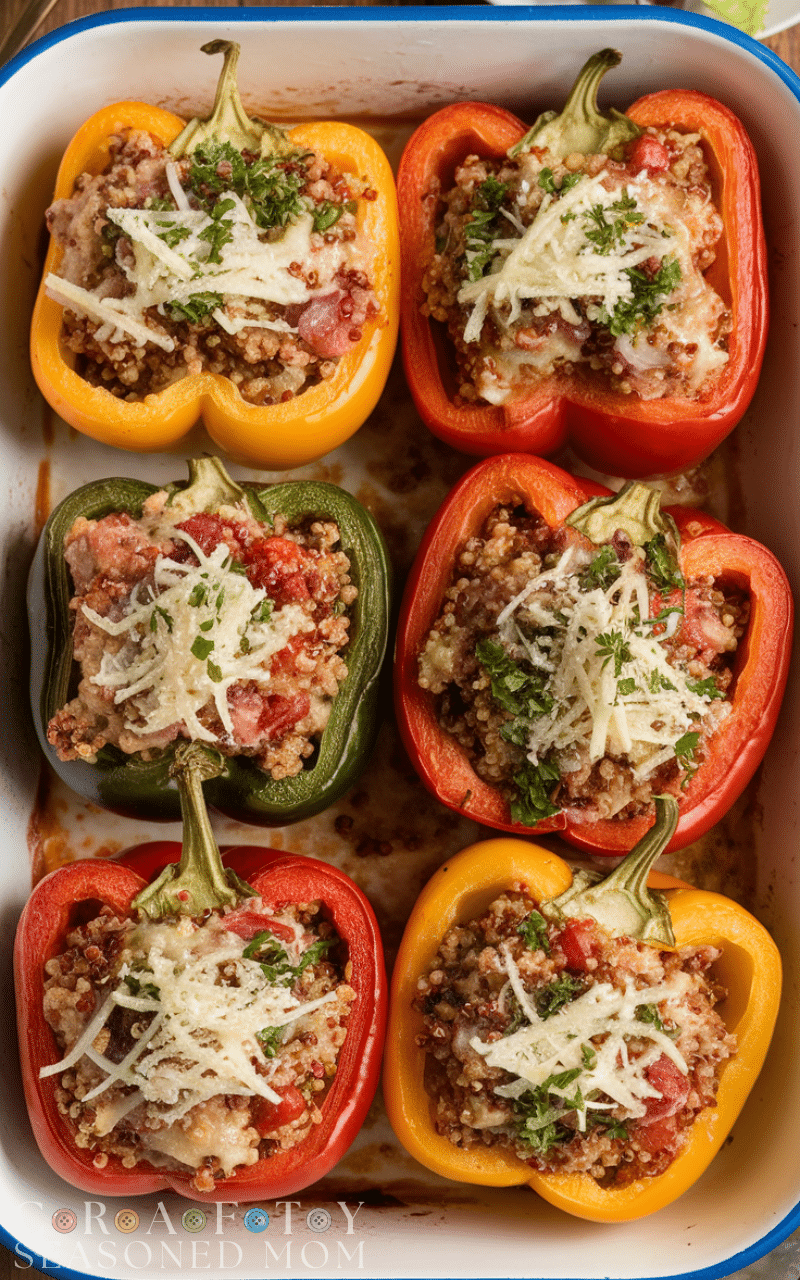 Colorful stuffed peppers are one of those classic Quinoa Recipes that always look impressive on the table while still being surprisingly simple to prepare, especially when filled with a mixture of quinoa, tomatoes, onions, herbs, and cheese that bakes together into a warm and satisfying dish. I appreciate how baked vegetable-based Quinoa Recipes like this one create balanced dinners that feel hearty enough for the whole family while still keeping preparation manageable during the week.