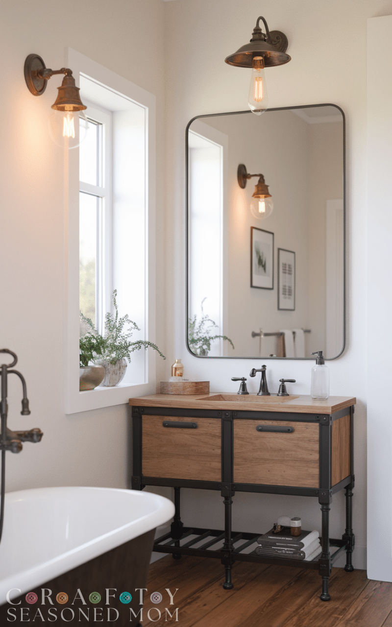 Lighting plays a big role in Modern Farmhouse Bathroom Decor Ideas, and vintage-inspired fixtures are a perfect choice. Think barn-style sconces or simple metal lights with warm bulbs. These fixtures add character and a touch of nostalgia while still feeling fresh and modern.