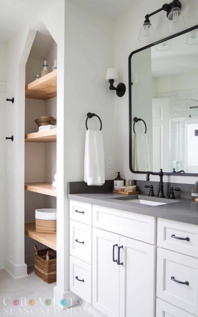 Display neatly folded towels, glass jars, or small plants to keep the look organized and intentional. Open shelving keeps the bathroom feeling open and relaxed, which is key to farmhouse-inspired spaces.