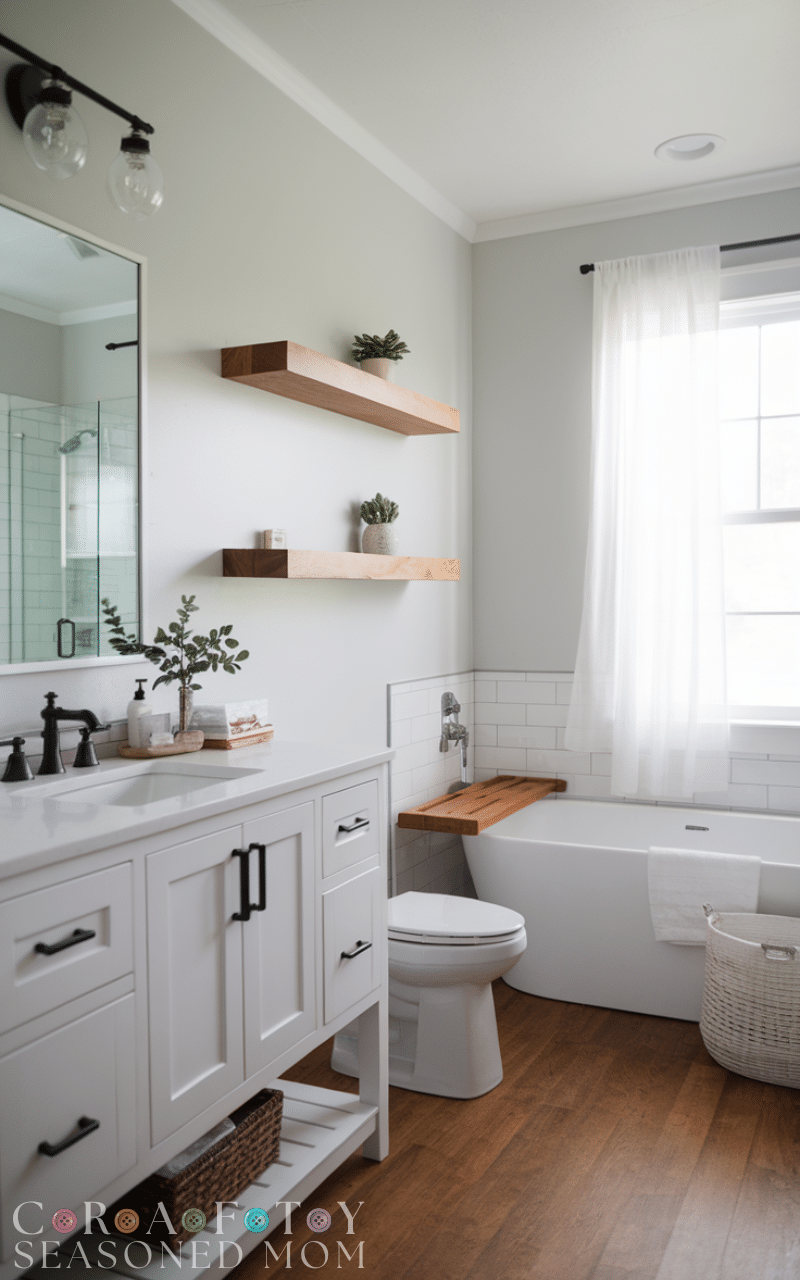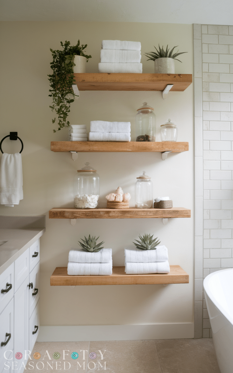 Open shelves are practical and stylish Modern Farmhouse Bathroom Decor Ideas. Natural wood shelving provides storage while adding warmth and texture.