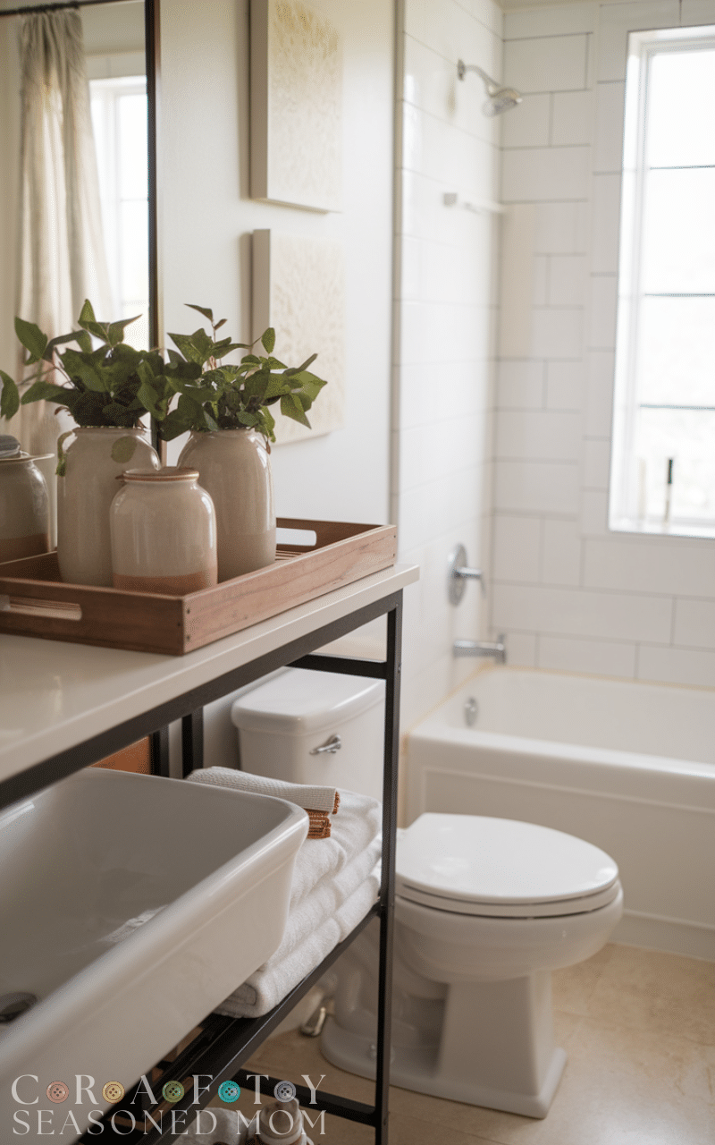 Adding plants is one of the easiest Modern Farmhouse Bathroom Decor Ideas to refresh your space. Greenery brings life, color, and a natural feel that complements wood and neutral tones. Even small plants on shelves or countertops can make the bathroom feel more vibrant and inviting.