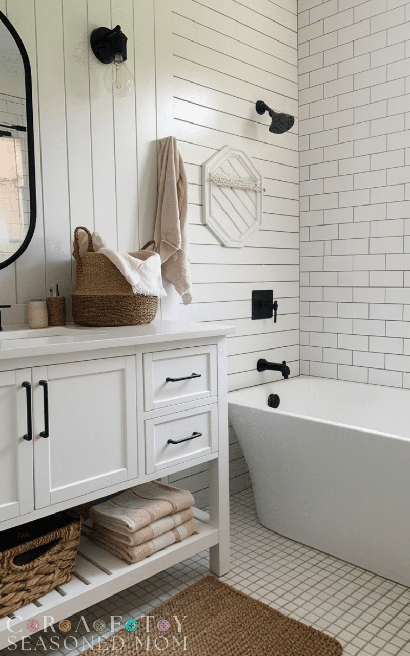 Matte black hardware is one of the easiest Modern Farmhouse Bathroom Decor Ideas to implement. Black faucets, handles, and towel bars create bold contrast against light walls and wood finishes.