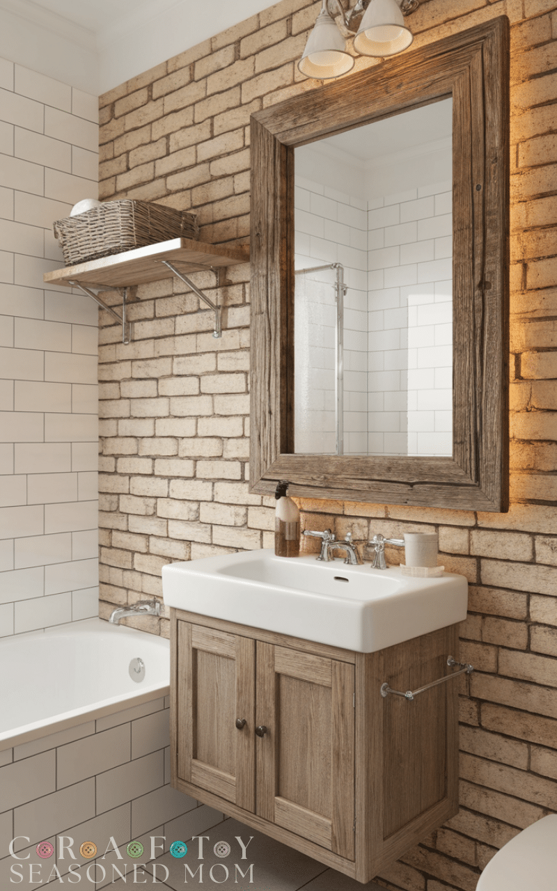 This combination creates a perfect blend of rustic and refined style. A wood vanity also grounds the space, making the bathroom feel inviting and thoughtfully designed.