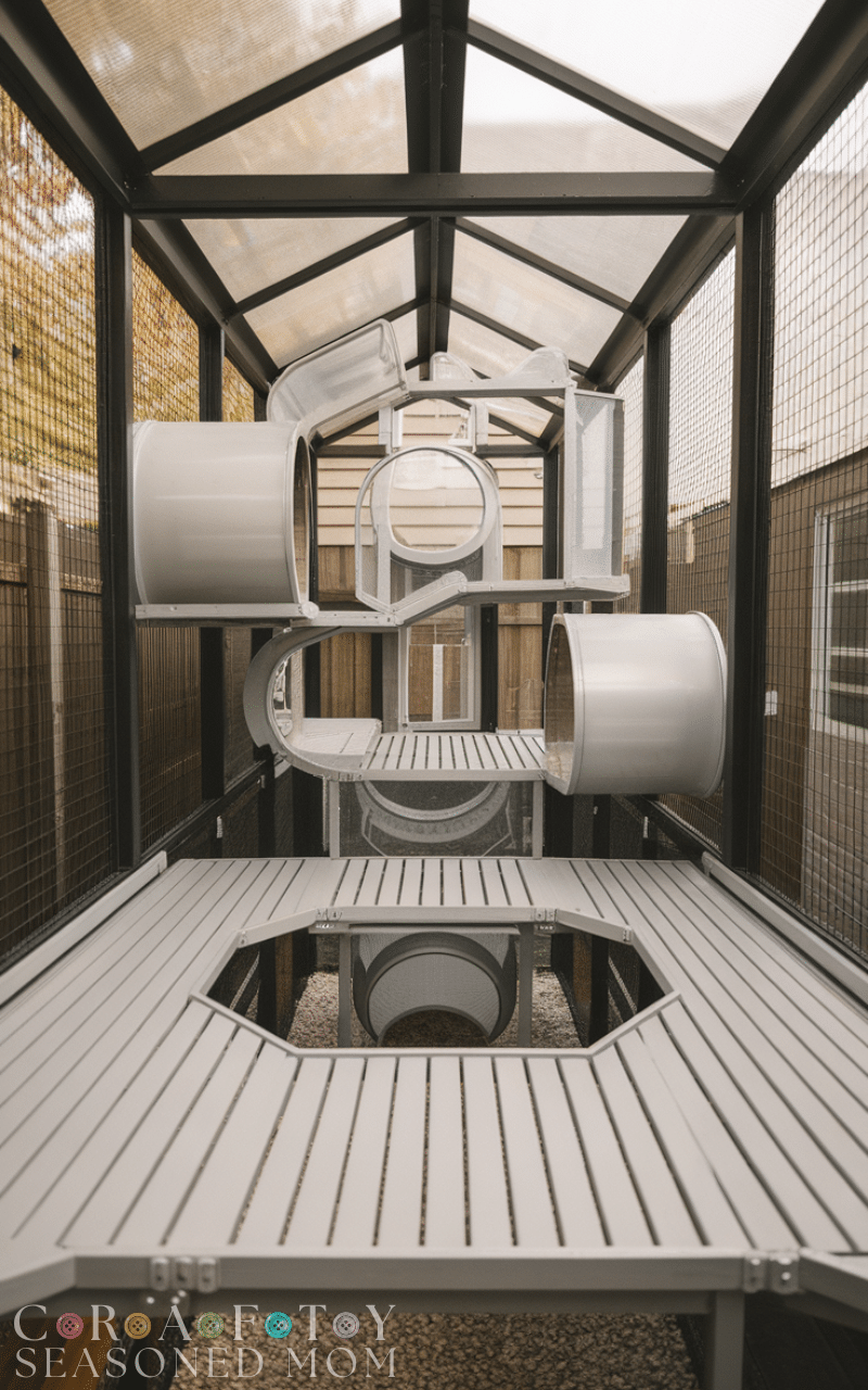Combination walkways connecting indoor spaces to an outdoor enclosure are the ultimate outdoor cat enclosure idea. These designs create seamless transitions from home to backyard, giving your cat freedom and safety simultaneously. Walkways can include clear tunnels, climbing sections, and resting pods, making your cat feel adventurous without risk. This approach ensures continuous outdoor enrichment while maintaining protection from predators, weather, and escape, representing the perfect balance between indoor comfort and outdoor excitement in a secure outdoor cat enclosure.