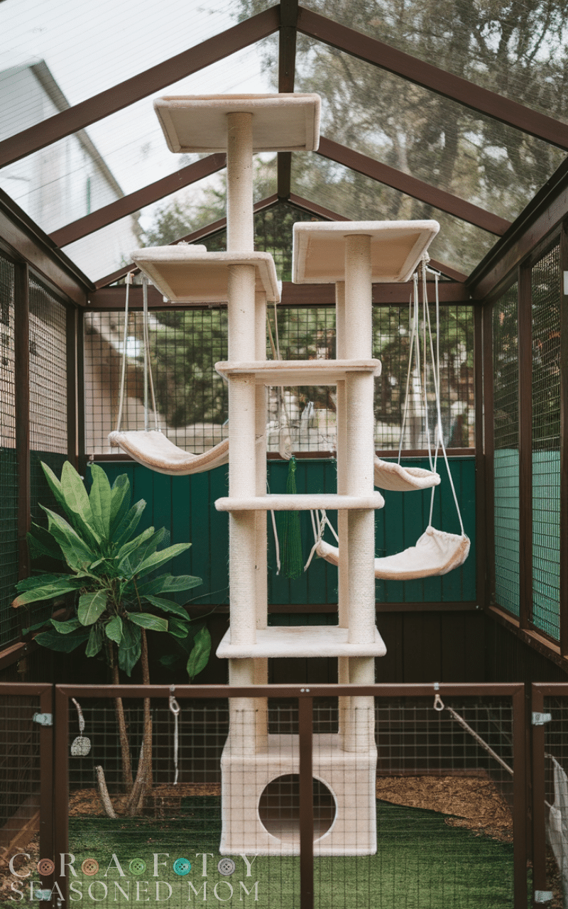 Adding vertical cat towers inside an outdoor cat enclosure creates climbing opportunities that satisfy your cat’s instinctual behaviors. This idea allows your feline to survey their surroundings safely from high vantage points, making them feel confident and entertained. Vertical towers can be designed with platforms, hammocks, and ropes, turning your outdoor cat enclosure into a multi-level playground. This setup maximizes space in smaller backyards while keeping cats active and happy, and it encourages natural exercise, mental stimulation, and safe outdoor exploration.