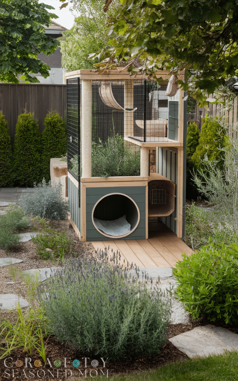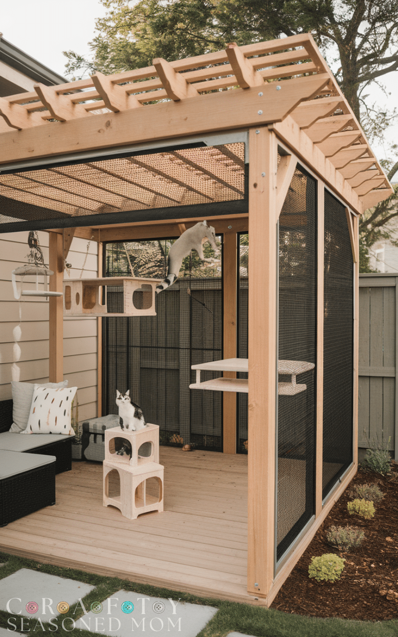 Transforming a pergola into an outdoor cat enclosure is an elegant way to combine architecture with feline fun. By adding mesh panels, climbing shelves, and hanging toys, you can create a shaded and secure playground. Cats enjoy climbing and perching, and a pergola-based outdoor cat enclosure offers both vertical and horizontal spaces to explore. This idea integrates seamlessly into your backyard design, providing your cat with stimulation, comfort, and safety while allowing you to maintain an aesthetically pleasing outdoor area.