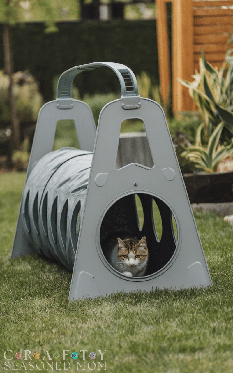 Free-standing cat tunnels are a unique outdoor cat enclosure idea that encourages exercise and exploration. These tunnels can be connected to a larger enclosure or placed separately in your garden, letting your cat roam safely while stimulating their natural curiosity. Made of durable, weather-resistant materials, free-standing tunnels allow cats to hide, climb, and play outdoors without danger. This outdoor cat enclosure idea works especially well for active cats who need both vertical and horizontal space to satisfy their adventurous instincts while staying protected.