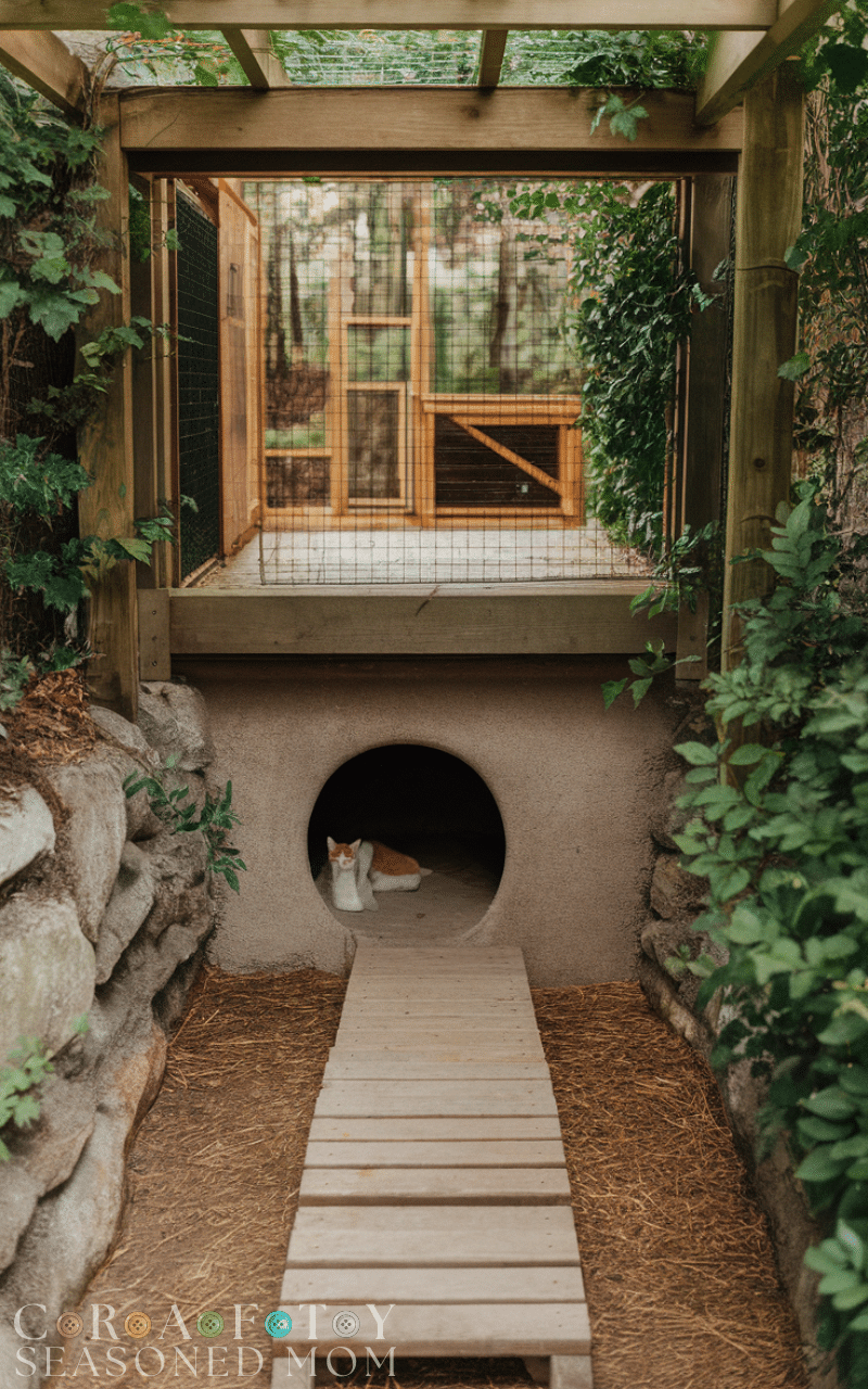 Underground cat caves are a unique outdoor cat enclosure idea for cats that love hiding and burrowing. These enclosed tunnels or sunken spaces provide a cool, shaded retreat during hot days and a sense of security for timid cats. Built with sturdy materials and connected to a larger above-ground enclosure, these cat caves enhance your outdoor cat enclosure experience by offering variety, exploration, and cozy hideaways, ensuring your feline feels safe and entertained in a natural, enriching environment.