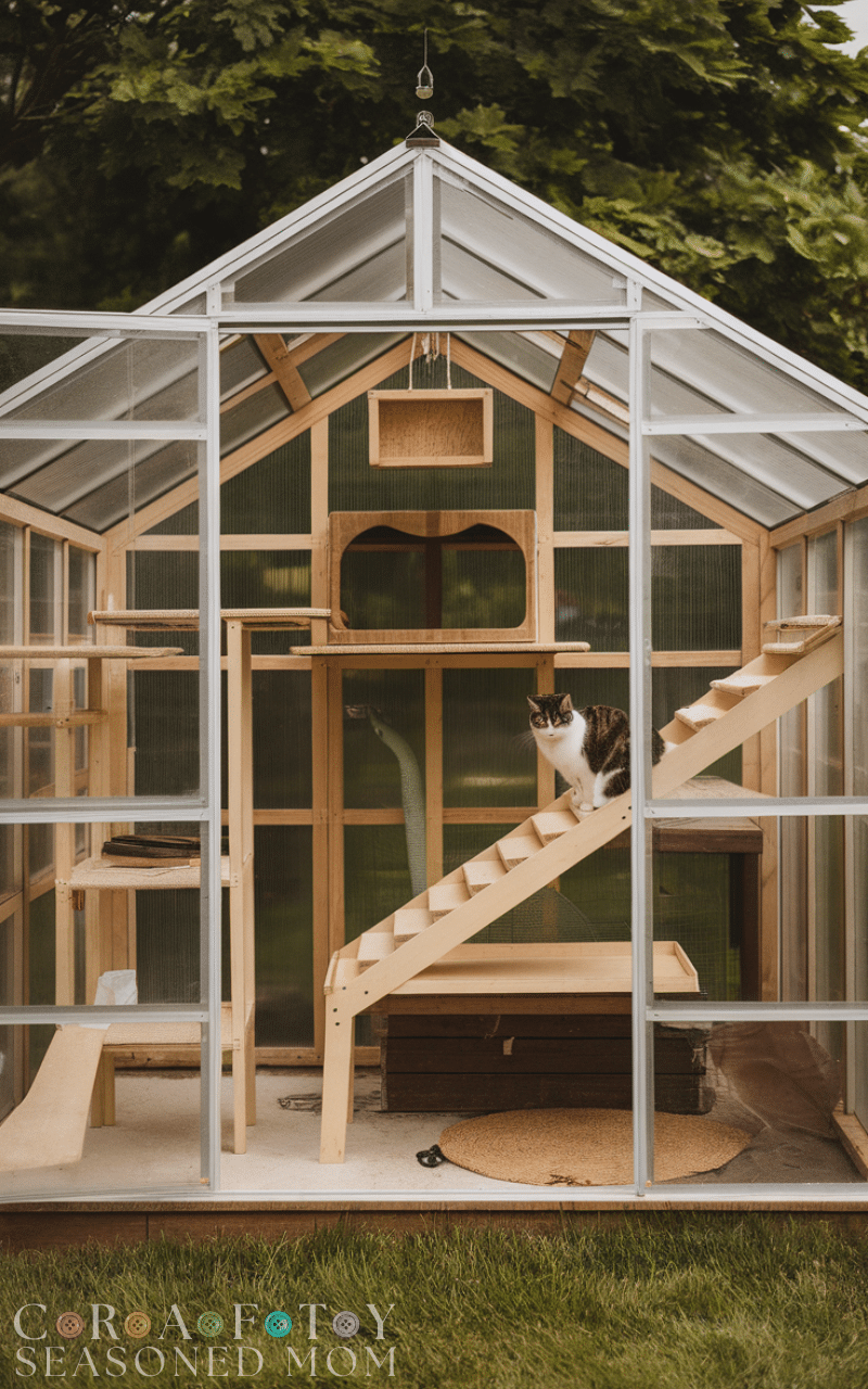 Converting a small greenhouse into an outdoor cat enclosure is a clever way to reuse space while keeping cats safe. Greenhouses offer protection from rain, wind, and sun, while providing an exciting environment for exploration. By adding climbing structures, resting shelves, and toys, you can create an engaging outdoor cat enclosure where your feline enjoys the sights, sounds, and smells of nature. This idea combines sustainability with safety, giving your cat a protected yet stimulating outdoor playground.