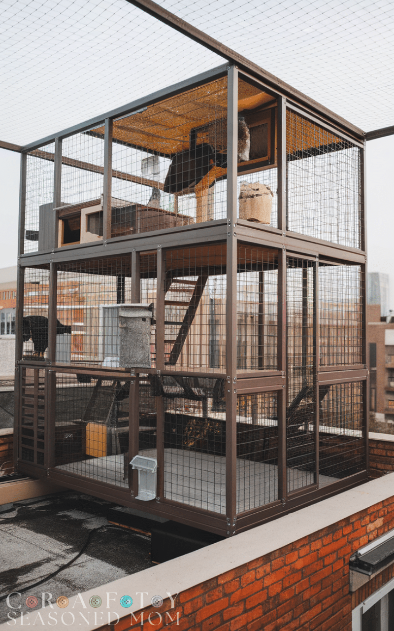 Rooftop enclosures are a creative outdoor cat enclosure idea for homes with accessible flat roofs. Multi-level designs maximize vertical space, offering platforms, ladders, and hideaways. Cats love surveying from heights, and a rooftop outdoor cat enclosure provides exercise, stimulation, and sunbathing spots. With safety netting or fencing, your feline can explore the outdoors confidently. This design transforms unused rooftop areas into secure playgrounds, making it a fun and elevated solution for adventurous cats while ensuring complete protection from potential hazards.
