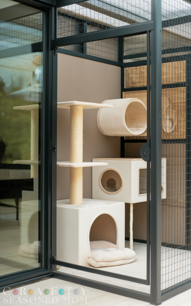 Connecting a cat room to your patio is a modern outdoor cat enclosure idea that lets your feline move between indoors and outdoors safely. With a secure door or tunnel, your cat can access a patio-enclosed space, enjoying fresh air while staying protected. Patio-connected enclosures can include scratching posts, climbing shelves, and cozy spots for sunbathing. This idea is perfect for pet owners who want to provide outdoor enrichment without worrying about escapes, combining the comfort of indoor safety with the benefits of an outdoor cat enclosure.