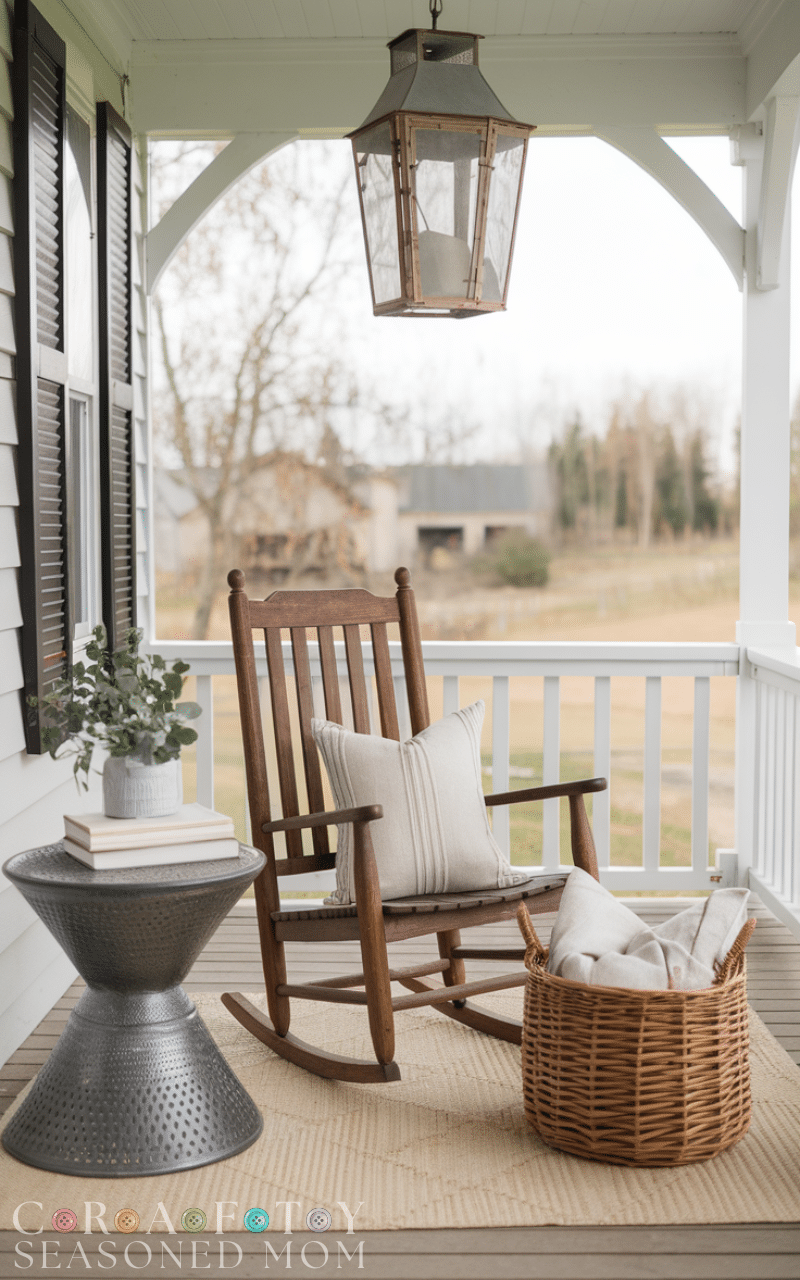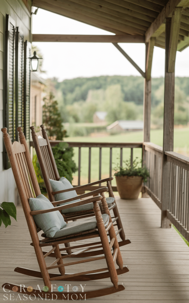 Classic wooden rocking chairs instantly create a rustic farmhouse vibe. Pair them with cushions or plaid throws for comfort and style—an easy and timeless rustic farmhouse porch decor idea.
