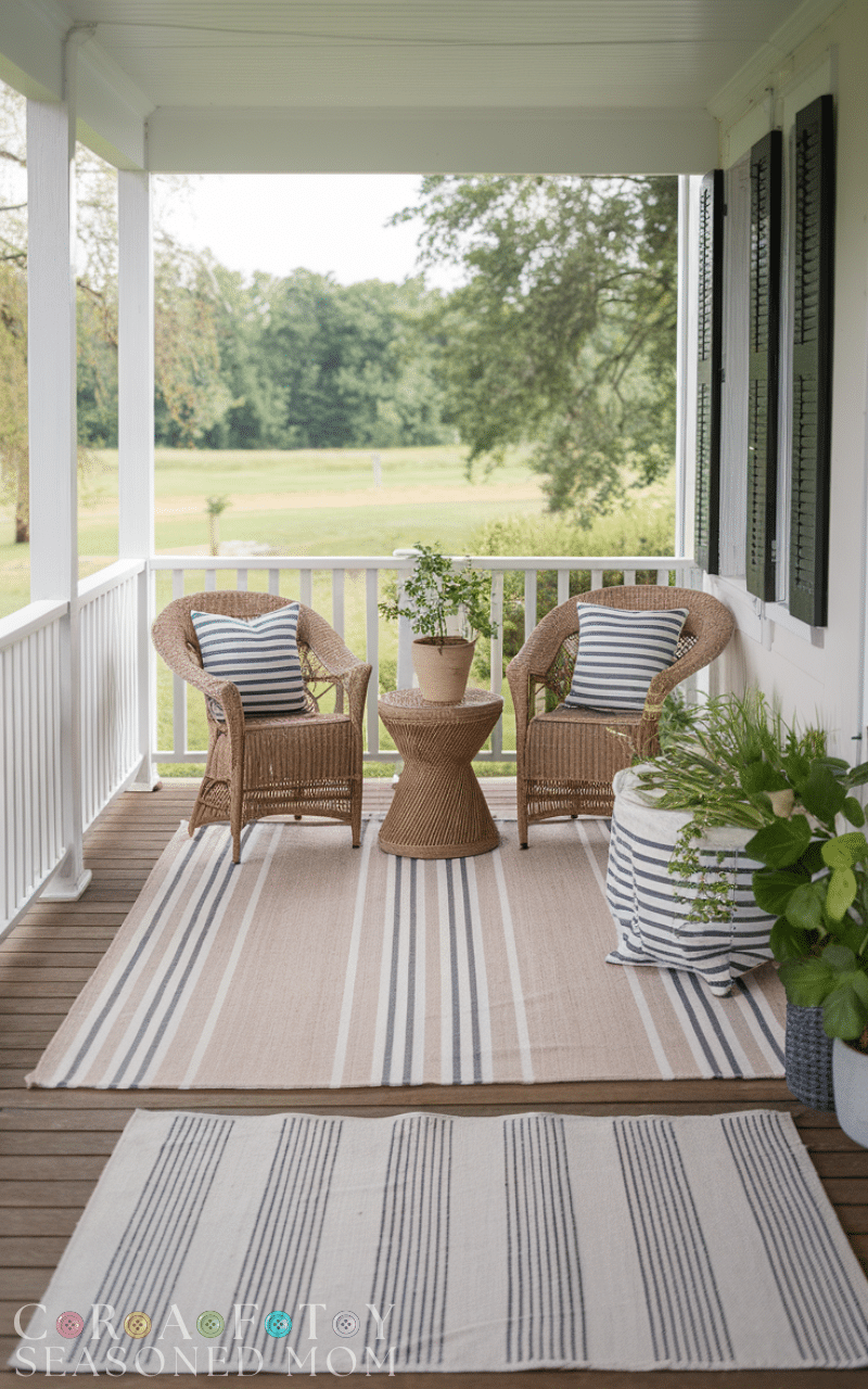 Layer neutral or striped outdoor rugs to define seating areas. This rustic farmhouse porch decor idea adds comfort, warmth, and visual interest without breaking the budget.