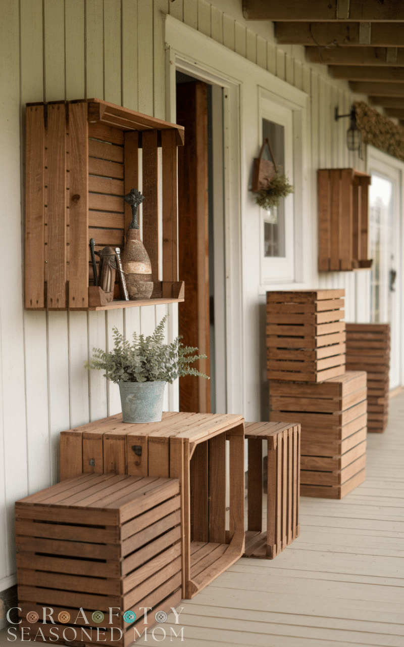 Repurpose wooden crates as side tables or storage units. This farmhouse porch decor idea combines charm with functionality, perfect for a casual outdoor space.
