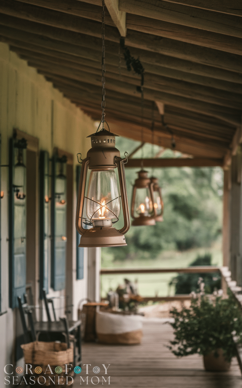 Place lanterns with candles or battery-operated lights along the porch. This farmhouse porch decor idea adds warm, ambient lighting and a cozy, welcoming atmosphere.