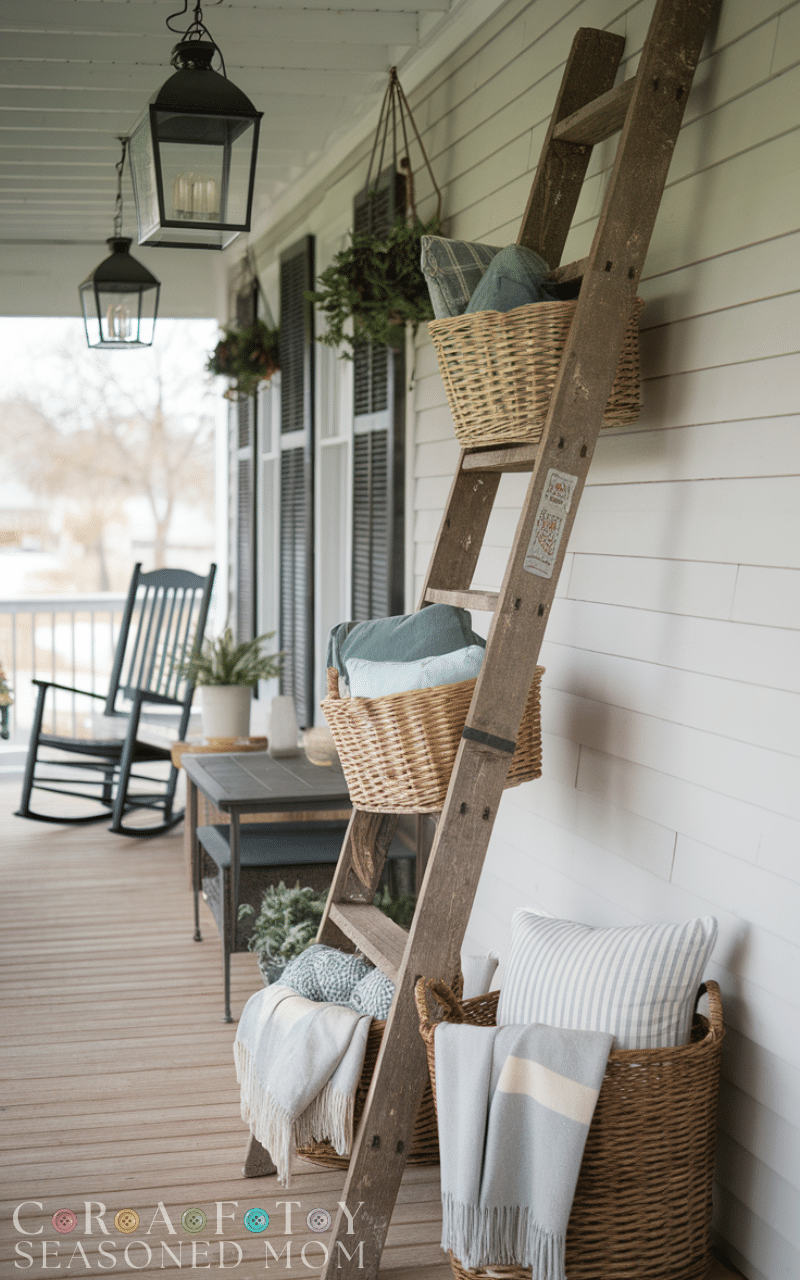 Use baskets to store blankets, pillows, or seasonal decor. This farmhouse porch decor idea adds texture and practicality while keeping the porch looking organized.