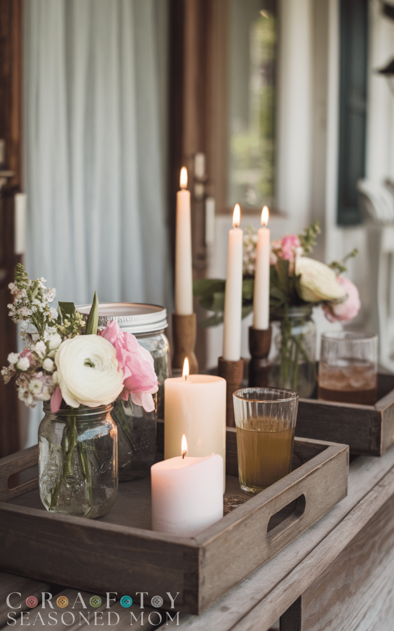 Use trays to hold small decor items, candles, or drinks. This rustic farmhouse porch decor idea adds organization and charm while making the space practical for gatherings.