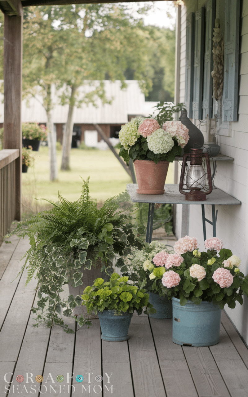 Arrange potted plants or flowers on the porch floor or tables. This rustic farmhouse porch decor idea brings life and freshness, connecting your porch to nature.