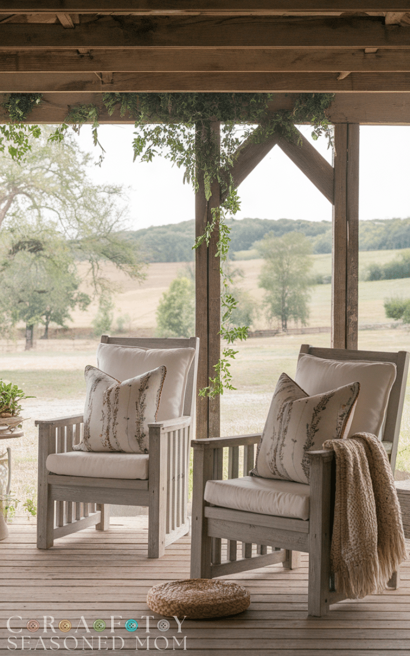 Add textured pillows and cozy throws on chairs or benches. This rustic farmhouse porch decor idea enhances comfort and makes your porch feel inviting and lived-in.