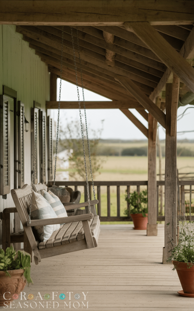 Install a wooden swing or bench with cushions. This rustic farmhouse porch decor idea provides comfortable seating while emphasizing farmhouse charm.