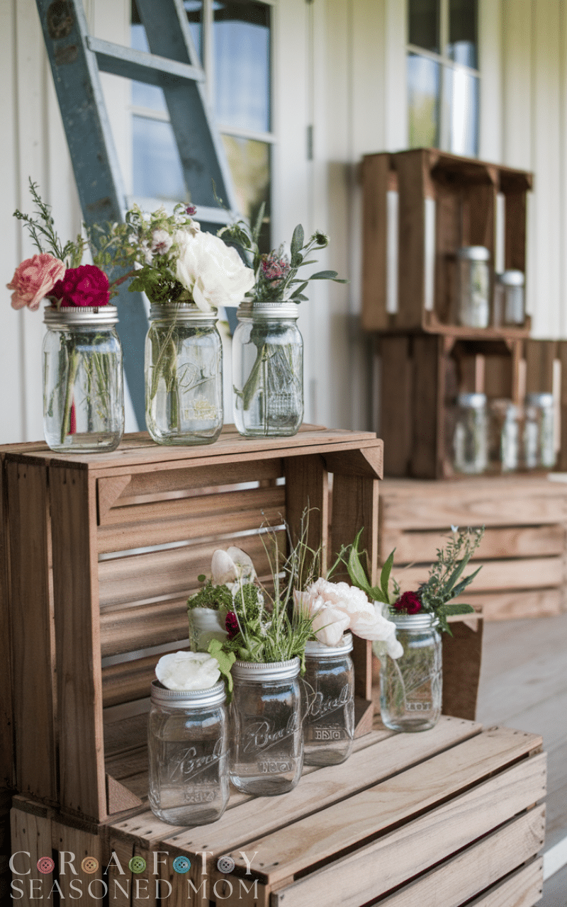 Use mason jars as planters for flowers or herbs. This simple rustic farmhouse porch decor idea adds greenery, color, and a personal DIY touch.