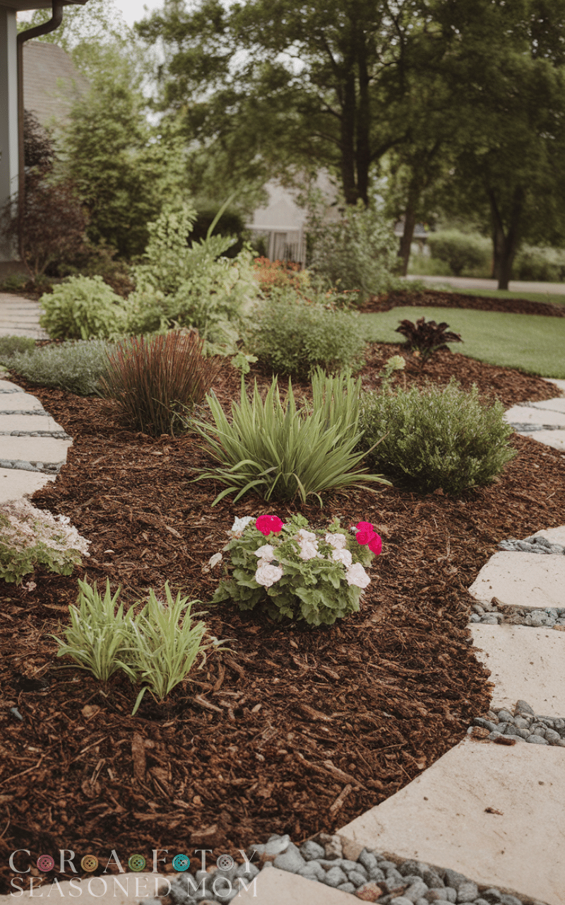Using mulched planting beds can make your simple front yard landscaping look neat and organized because mulch retains moisture and suppresses weeds and it improves soil health and you can use natural bark or colored mulch to complement the surrounding plants and arranging shrubs and flowers in mulched beds highlights their beauty and helps your yard feel more intentional and cared for and this method is both practical and attractive making simple front yard landscaping effortless and sustainable and it enhances the overall design while keeping maintenance low.