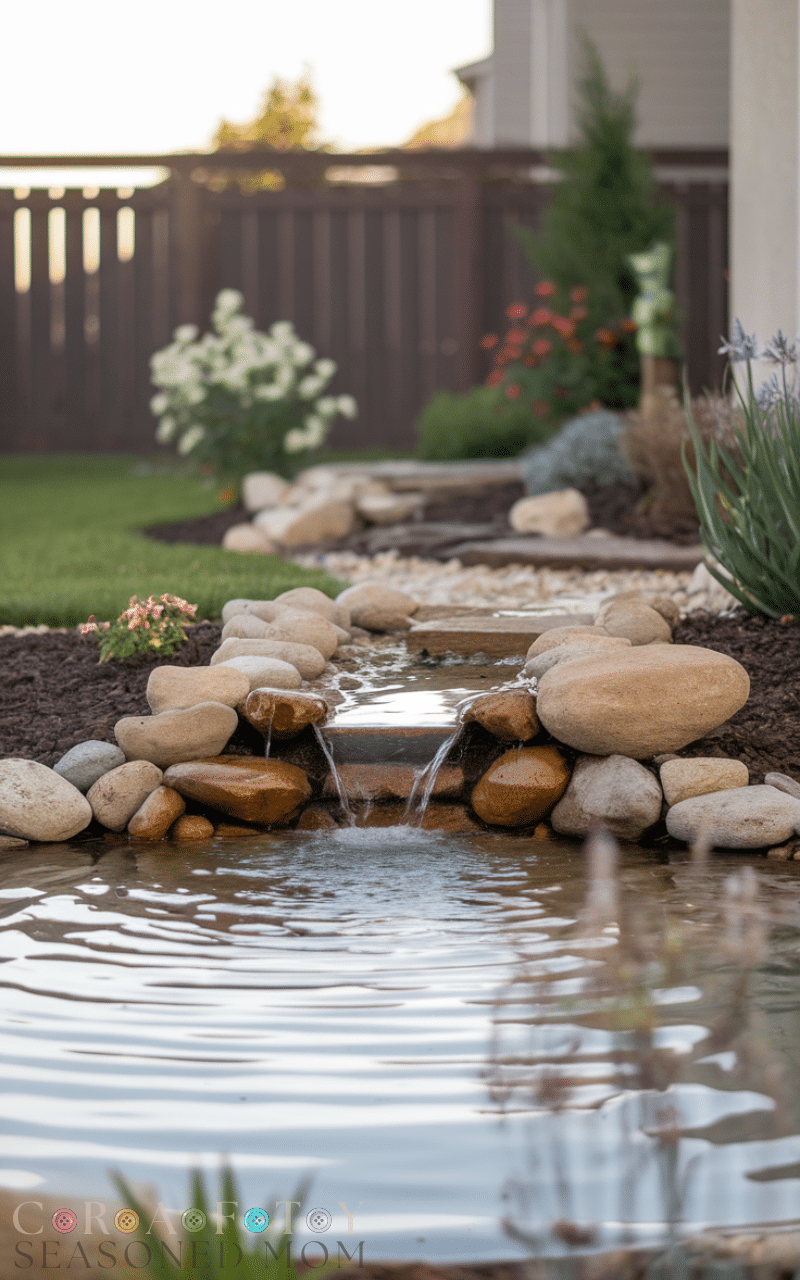 Adding small water features is perfect for simple front yard landscaping because the sound of flowing water creates a calm and peaceful atmosphere and it can become a focal point in your yard or complement other elements such as flower beds and rocks and even a small fountain or pond can bring charm and a sense of luxury and water features attract birds and add life and movement to your simple front yard landscaping making it relaxing and visually appealing and it requires minimal maintenance but adds maximum impact.