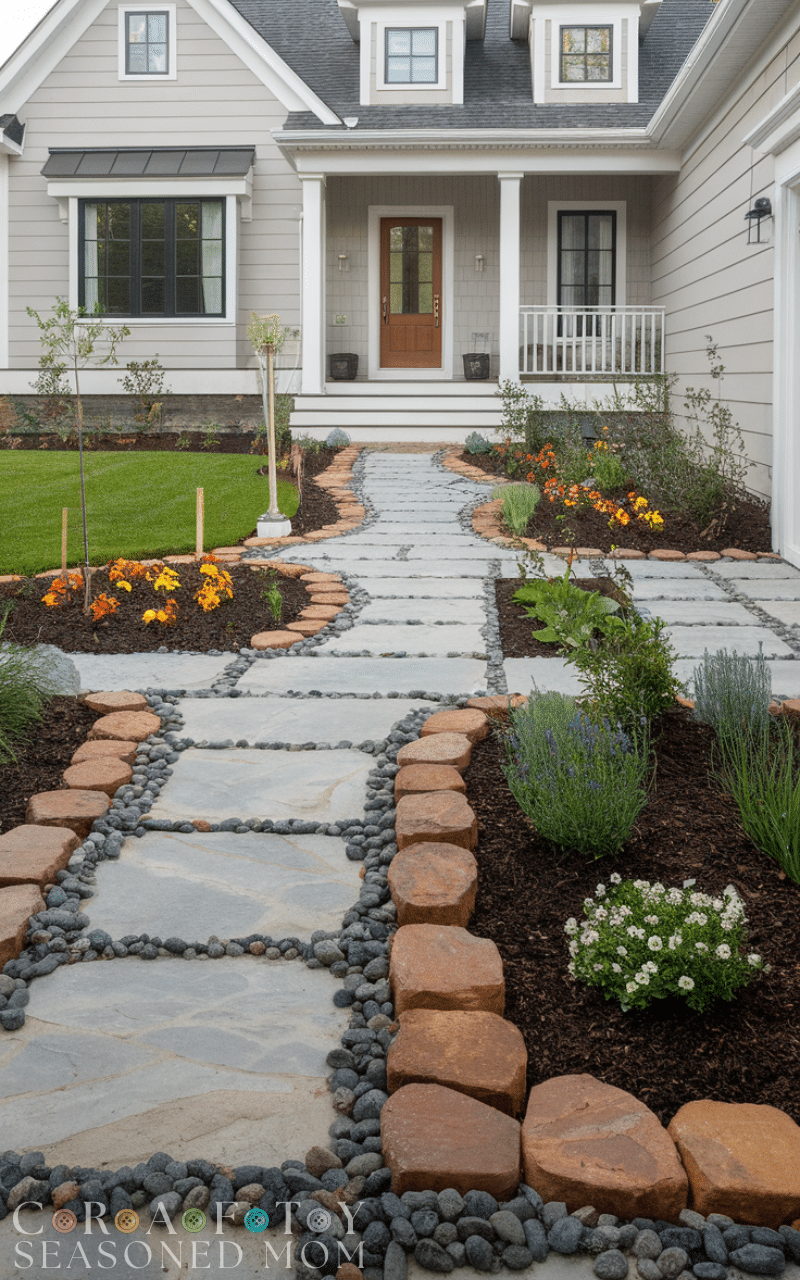 Creating minimalist stone pathways can completely transform your simple front yard landscaping because they add structure and charm at the same time and they are easy to maintain and blend perfectly with any garden style and using natural stones makes it feel organic and inviting and you can also line the paths with low plants or flowers to add more character and this simple front yard landscaping idea ensures that visitors are guided naturally through the space and it makes your yard look organized and beautiful and it does not require much effort or upkeep at all.